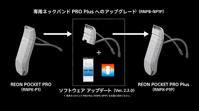 なお、従来モデルの「REON POCKET PRO」を既にご利用の方は、ソフトウェアアップデートと、新型ネックバンド「RNPB-NP1P」へ付け替えを行うことで、実質的に「REON POCKET PRO Plus」へのアップグレードが可能です。