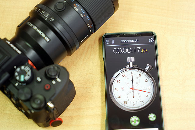 撮影はスマートフォン「Xperia 1 VII」でストップウォッチアプリによる表示を連写撮影します。「Xperia 1 VII」は120fps表示が可能なモデルなので、秒30コマ連写くらいなら余裕で表示性能が上回ります。