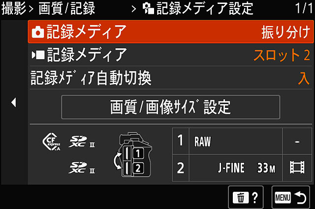 スロット1にCFexpress Type Aを挿して、スロット2にSDカードの最速カードを挿すと最強状態になります。これで書き込みに時間がかかりそうなRAW記録をスロット1に、JPEG記録をスロット2に振り分けたら、もっと連写可能な撮影枚数が増えるんじゃないの!?とか、思いますよね。