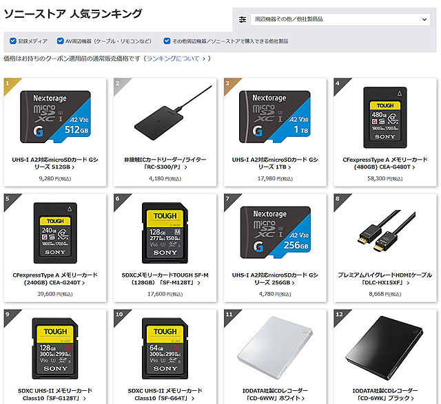 なので、無理して購入する必要もなさそうなんですけど、多くの方がメモリー購入はされているみたいで、ソニーストアの人気ランキングでも、記録メディアなどに人気があるように見えます。