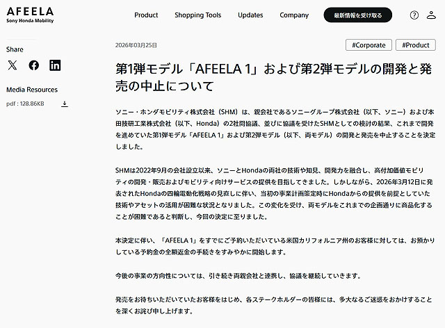 本日夕方、ソニー・ホンダモビリティからニュースリリースが公開されました。 ソニー・ホンダモビリティで進めていた「AFEELA 1」および第2弾モデルの開発と発売が中止になることが発表になりました。 こんにち […]