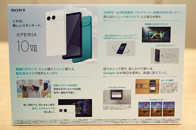 二番目が進化した広角カメラの性能、2日持ち&4年長寿命バッテリー(Xperia 10 VIでは3年持ちで訴求していました)。4回のOSバージョンアップ&6年のセキュリティアップデートなどはフラッグシップモデルのXperia 1 VIIと同じですからね。