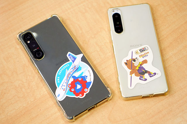 純正ケースが今回はハーフスケルトンになっていて、写真の様に(これはXperia 1 VとXperia 5 IVです)こうしてシールなどを背面に入れて使うことが可能。