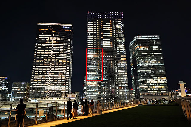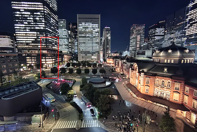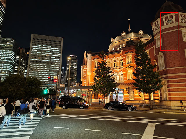 KITTE前の横断歩道で24mmにて撮影。(Xperia 10 VIは26mm)画面右上のレンガのところに注目。