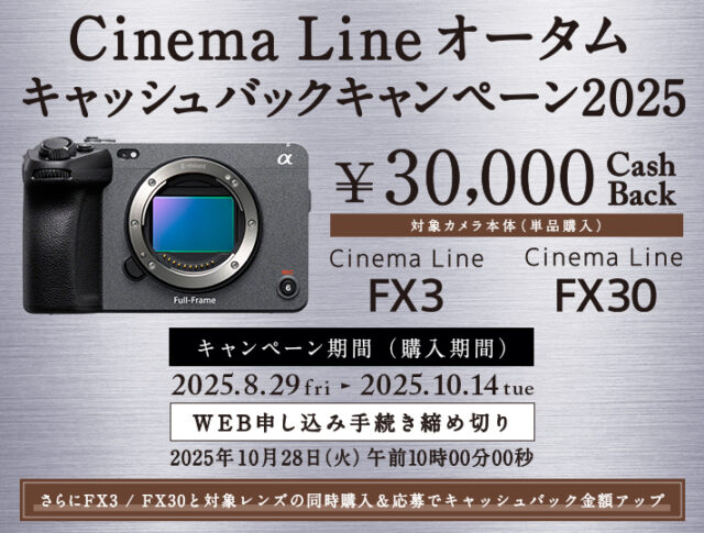 また、Cinema Lineカメラ『FX3』『FX30』でも3万円のキャッシュバックキャンペーンのを実施中です。