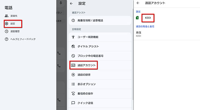 そこから「設定」>「通話アカウント」にすすみ、SIMを使っている通信キャリアが表示されたらそれをタップします。ここではXperia 10 VIIにpovo 2.0のSIMカードを挿しているので「KDDI」をタップします。
