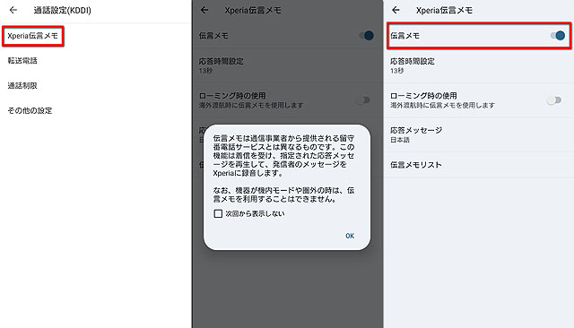そこに「Xperia伝言メモ」という項目があるので、これをタップして「伝言メモ」のスイッチをオンにします。