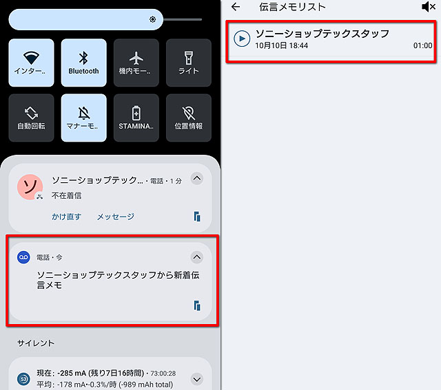 留守番電話が記録されると、画面上からスワイプして表示される通知パネルに記録があります。通知は削除しても、設定メニュー内の“伝言メモリスト”から再生可能です。