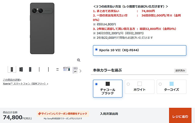 ソニーストアでは「Xperia 10 VII」を74,800円にて一括購入できるほか、36回分割払いや2年後に本体を返却することを前提に支払い額を抑えることができる2年残価設定クレジットの設定があります。