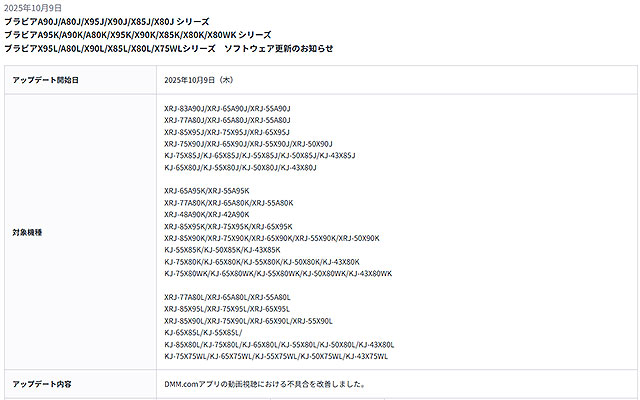 2021年-2023年モデルのブラビアにソフトウェアアップデート公開 DMM.comアプリの動画視聴時における不具合修正