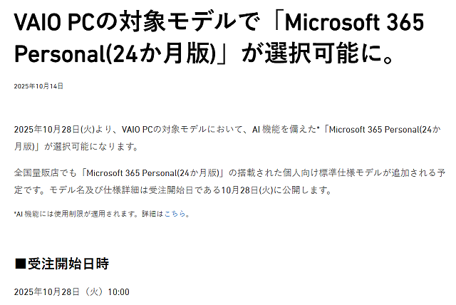 VAIO PCでAI 機能を備えた「Microsoft 365 Personal(24か月版)」が選択可能に 10月28日(火)10:00受注開始
