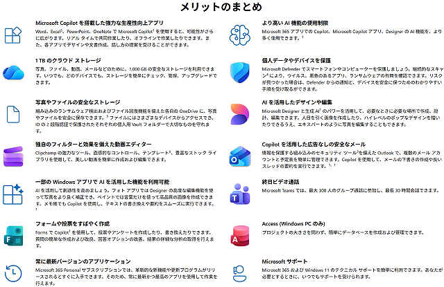 WordやExcelなどのOfficeアプリ、1TBのOneDriveクラウドストレージ、高度なセキュリティ、Microsoft Copilot を搭載した最新のアプリ機能、そして技術サポートなどが含まれています。