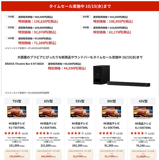 このタイムセールでは43型~75型までが一斉に値下がっており、AV10%OFFクーポンを利用すれば55型以下はすべて10万円を切る価格でお買い求めいただけます。期間は10月15日までとなっています。