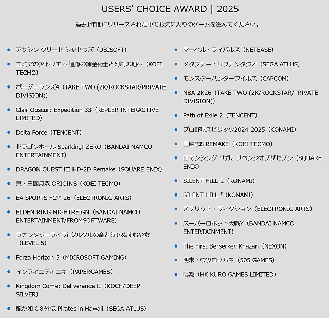 なお、日本およびアジア地域において、プレイステーション フォーマットにおけるタイトルの表彰を行なう「PlayStation Partner Awards 2025 Japan Asia」が12月3日に開催されることに伴い、本日よりユーザー投票の受付がスタートしています。