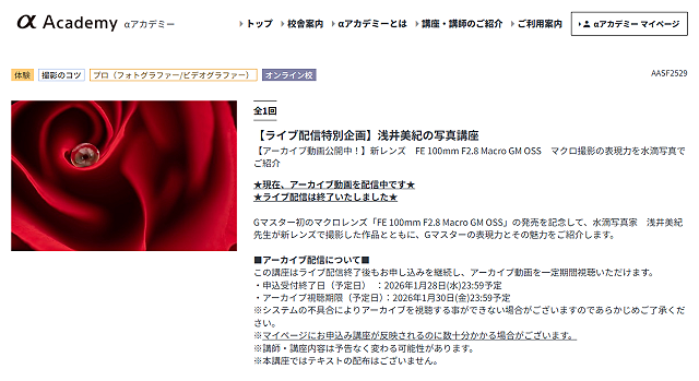 α アカデミーにて浅井美紀先生による2025年11月21日発売予定の新型マクロレンズ「SEL100M28GM」写真講座の無料アーカイブ動画を配信中です。