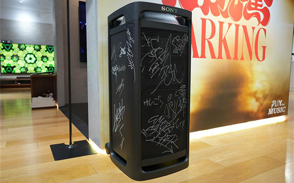 梅田サイファーや当日、イベントを盛り上げてくれたパフォーマーたちのサインが入った、ソニーのワイヤレスポータブルスピーカー『ULT TOWER 9』が展示されします。