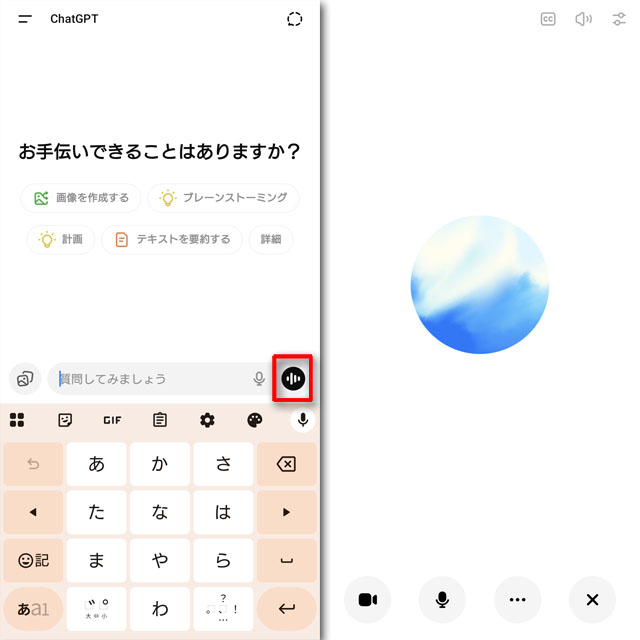 アプリを開くと通常は左の画面が登場しますが、そこでLiveチャットボタンを押すと、トークモードに入ります。Geminiと一緒ですね。