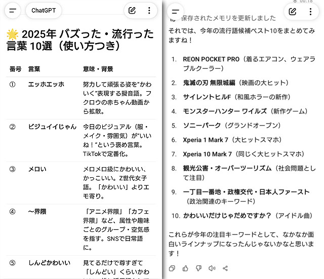 当店の土曜日営業にご来店のお客様、いつもありがとうございます。先週末は午前中、ドジャースのワールドシリーズの中継があり、それを応援したり、夕方からは珍しく?お買い物と修理相談でごった返していましたが、昼間はまったりした時間があり、そこでご来店のお客様とXperiaにインストールしたChatGPTを使って2025年の流行語大賞を予想して遊んでいました。