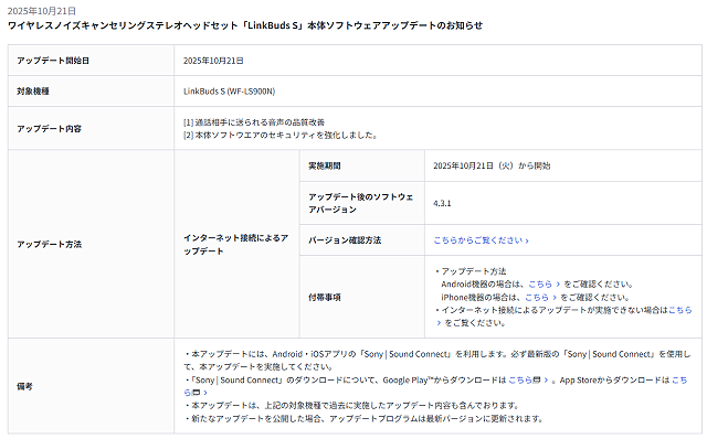 ソニーのワイヤレスヘッドホン「WH-1000XM4」「WF-1000XM4」「WH-XB910N」「LinkBuds」で本体ソフトウェアアップデートが公開になりました。