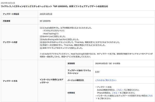 「WF-1000XM5」のアップデート「Ver.6.0.0」が公開になりました。内容は以下のとおりです。