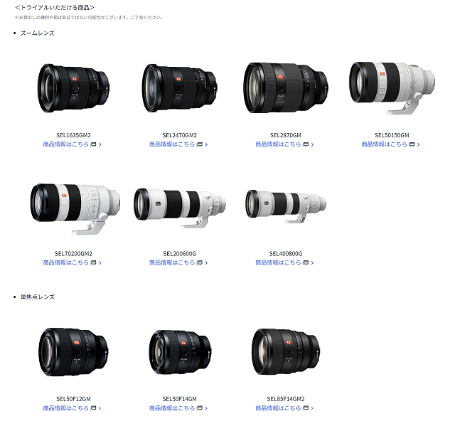 対象レンズはズームレンズが「SEL1635GM2」「SEL2470GM2」「SEL2870GM」「SEL50150GM」「SEL70200GM2」「SEL200600G」「SEL400800G」の7本、短焦点レンズが「SEL50F12G」「SEL50F14GM」「SEL85F14GM2」の3本で合計10本となります。半数以上がG MASTERシリーズという豪華さ。