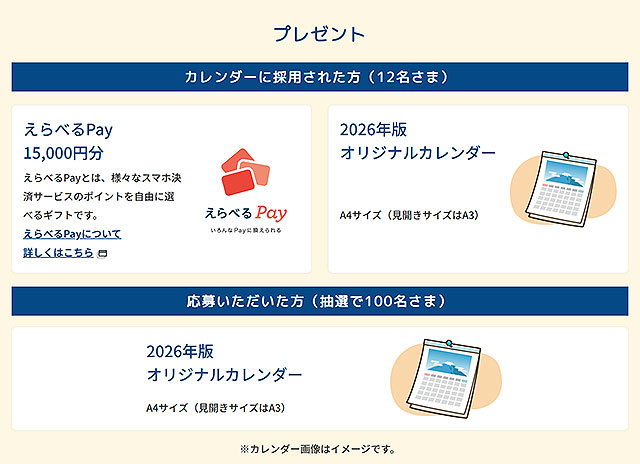 賞品として、12作品にれた採用された方には選べるPay 15,000円とオリジナルカレンダーがプレゼントされます。また、作品を応募した方の中からも抽選で100名にオリジナルカレンダーがプレゼントされます。