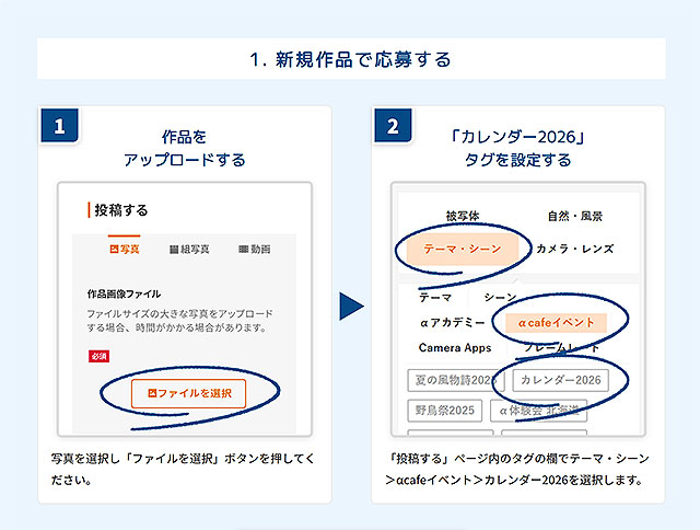 写真を選択し「ファイルを選択」ボタンを押してください。「投稿する」ページ内のタグの欄でテーマ・シーン>αcafeイベント>カレンダー2026を選択します。