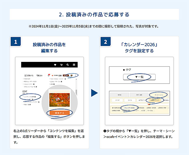 作品応募にあたって新規作品または投稿済み作品に「カレンダー2026」タグを加えて投稿してください。2024年11月1日(金)~2025年11月5日(水)までの間に撮影して投稿された写真が対象です。