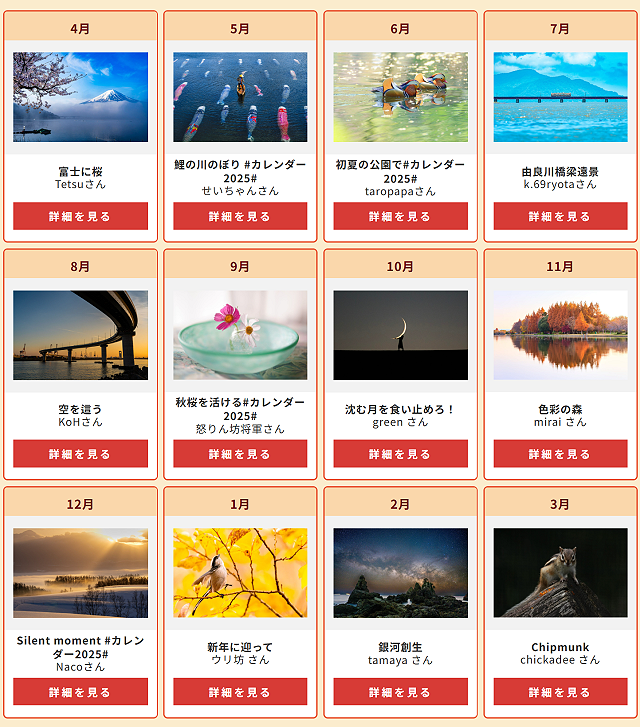 ちなみに2025年カレンダーの採用作品はこんな感じです。季節感のあるモチーフや風景が選ばれやすい感じがします。