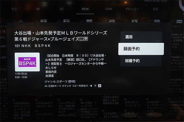 明日のMLBワールドシリーズ第6戦はNHK BSプレミアム4Kで放送があるんです。大谷選手出場、山本選手が先発する第6戦が4Kブラビアなら、その迫力を4K画質で楽しめます