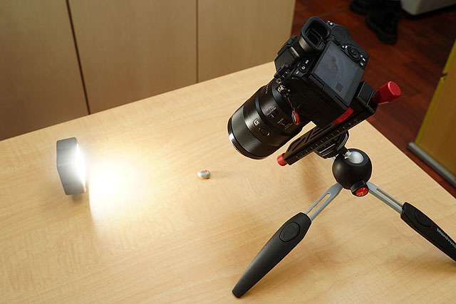 テーブルの上で、こんな感じで撮影してみたんですが、なるほど、マクロスライダーを使うと距離の微調整が楽にできます。
