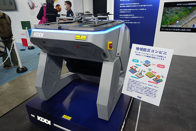 こちらはKDDIさんの展示で、ドローンポートの展示です。運搬時はこれに屋根が被さって、ドローンが発進するときにはご覧の形態になり、ドローンを飛ばして地域の情報収集をするそうです。