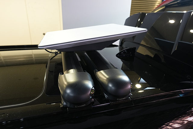 こちらがアンテナです。走行中に通信できるかどうかはわかりませんが、ドコモさんもStarlinkの利用をしているんですね。近いうちに「au Starlink Direct」の様なサービスも期待できますかね。