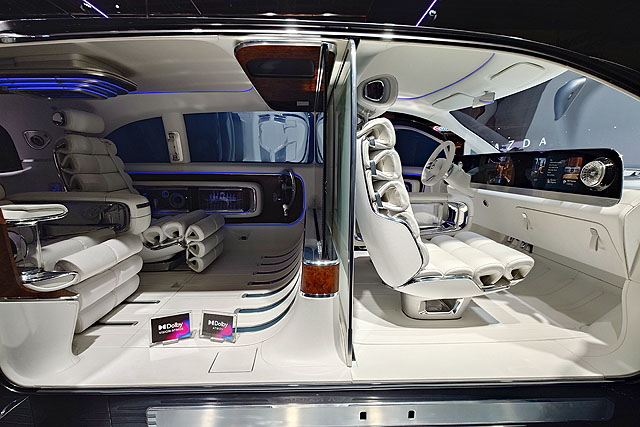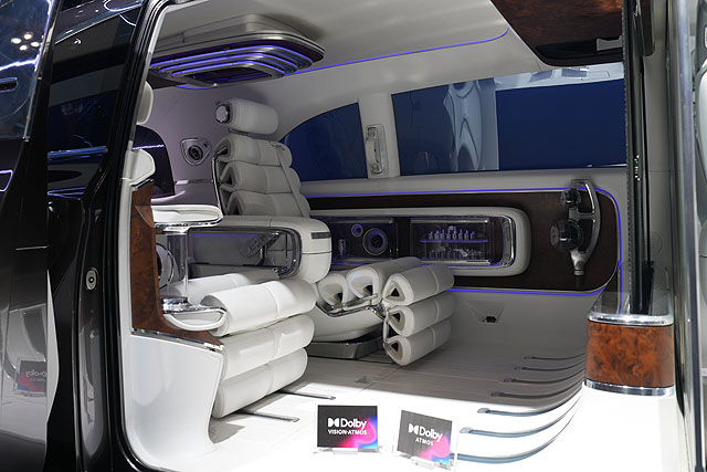 中身はもう宇宙船みたいになってます。運転席の全面ディスプレイもそうですが、スピーカーがあちこちにあり、足下には「ドルビーアトモス」の文字があります。