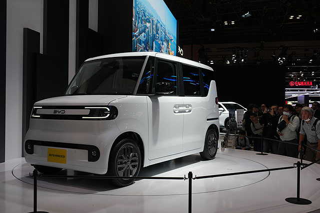 こちらも人だかりでした。中国のEVメーカー「BYD」が発表した軽自動車のEVカーです。ロングバージョンとショートバージョンの2車種を用意するという発表でサイズ以外のスペックはなにも発表がなく、クルマもドアが開いていないので内装は不明。