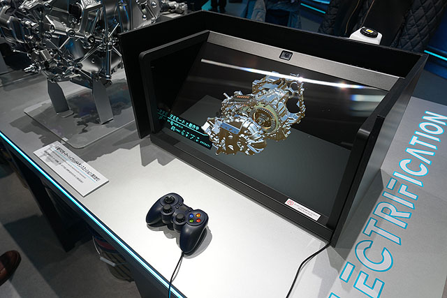 ソニーさんのショールームでのデモ展示しか見たことがなかったんですけど、実際の技術展示に使われているのを初めてみました。アイシンさんはミッションやモーター、ブレーキなどの自動車部品を作られている会社さんだそうですが、複雑なギアの構成を空間再現ディスプレイで展示していて、多くの方が食いついて見ていました。