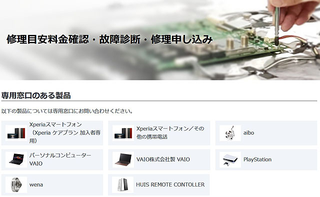 なお、XperiaやVAIO、Playstation製品など、専用窓口のある製品につきましては受け付け窓口は別になりますので、各ページをご確認ください。