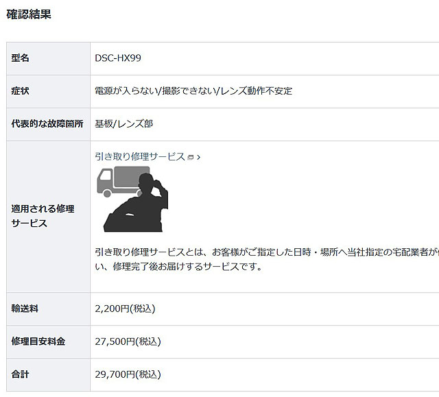 機種と、修理のおおよその様子を入力すると概算の見積もりが出ます。この場合は「定額修理」対象製品ということで、技術料と部品代がセットになった定額見積もりが出ています。
