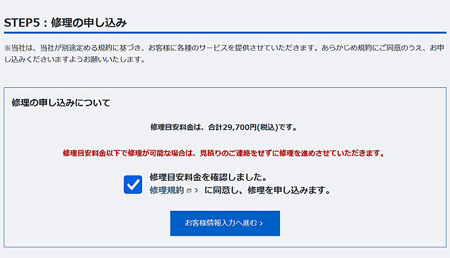 サイトから「修理料金目安・故障診断」を行っていただき、修理料金の目安を出していただくと、そのまま修理申し込みになる流れです。