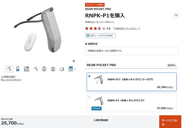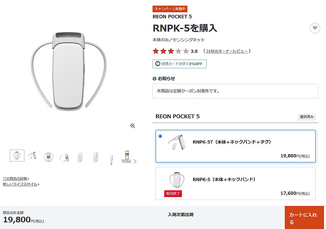 まだREON POCKETをお持ちでない方はこれからソニーストアで手に入れましょう! と、言いたいところなんですが本日時点で「REON POCKET PRO」のセンシングタグ付きのセット「RNPK-P1T」がソニーストアで入荷次第出荷ステータスになっています。