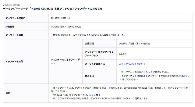 ゲーミングキーボード「INZONE KBD-H75」に初の本体ソフトウェアアップデート「Ver.1.1.5.0」が公開されました。