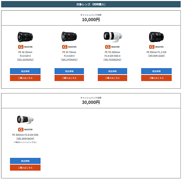 ”α”ボディはそのほとんどが対象で、レンズは上記9本になるんですけど「SEL300F28GM」というプロ向けのレンズは3万円キャッシュバックです。ぜひこの機会にご検討ください。