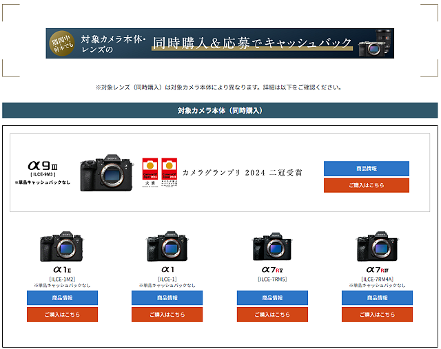 今回もカメラ25機種やレンズ30機種が対象になっており、人気の高画素機モデル「α7R V」と、スタンダードモデルの「α7 IV」が4万円、コンパクトフルサイズの「α7C II」が1万円のキャッシュバックになっています。