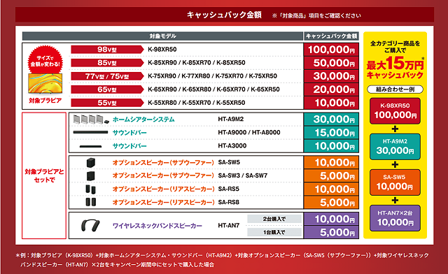最大15万円のキャッシュバックになる一例として4Kブラビア「K-98XR50」+ホームシアターシステム「HT-A9M2」+オプションスピーカー「SA-SW5(サブウーファー)」+ワイヤレスネックバンドスピーカー「HT-AN7」×2台を購入する組み合わせなどがあります。