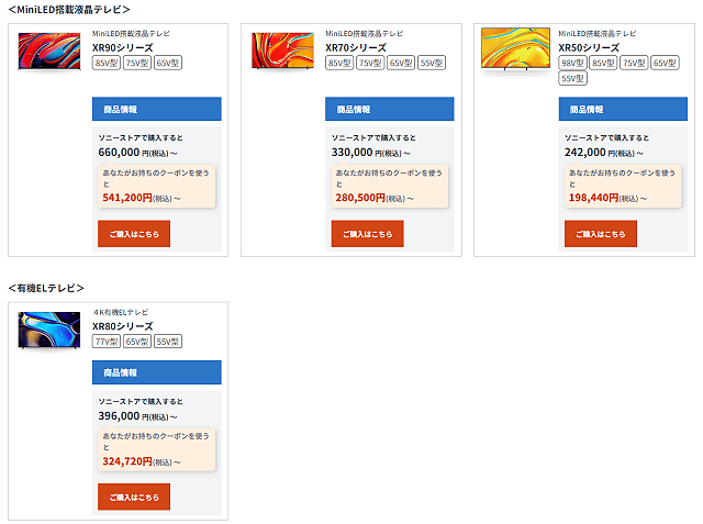 ブラビアは55型以上のモデルが対象でキャッシュバック金額は55型で1万円、65型で2万円、75型で3万円、85型で5万円、98型で10万円です。