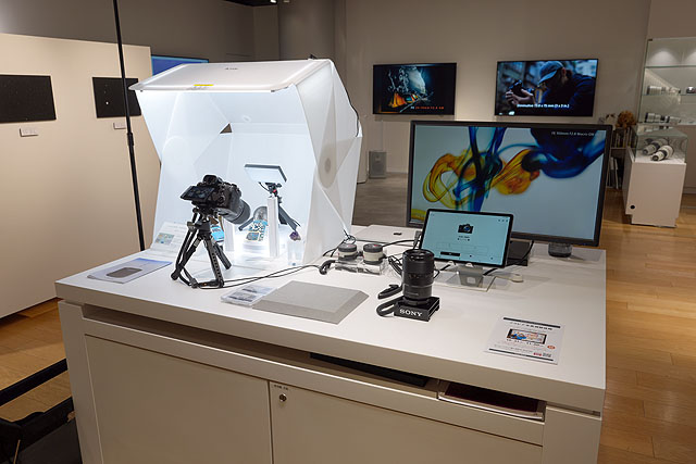 ソニーストア銀座さんでの「SEL100M28GM」の特別体験展示の様子はこちらです。テーブル撮影セットが組まれているのと、同じテーブルには90mmマクロレンズ「SEL90M28G」や、テレコンバーターレンズ「SEL14TC」「SEL20TC」も用意されていて一通りの試し撮り、比較撮影ができるようになっています。
