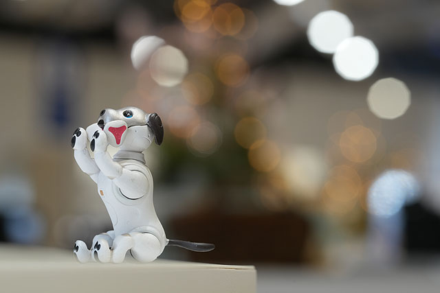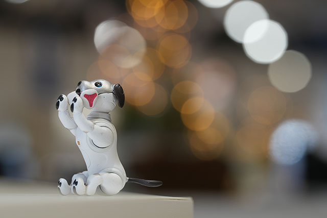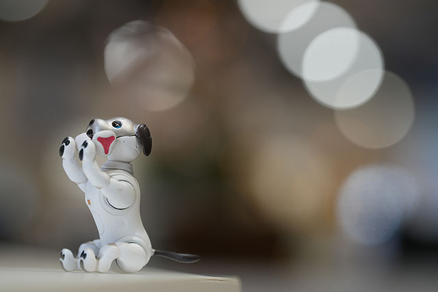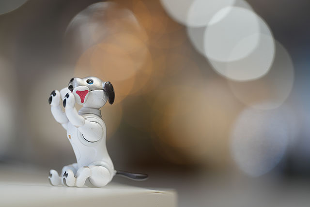 100mmの開放絞りF2.8の単焦点レンズとしても使えます。もちこんだミニチュアフィギュアをテーブルに置いて、ショールームにあるLED照明を背景にして点光源の撮影をしてみました。