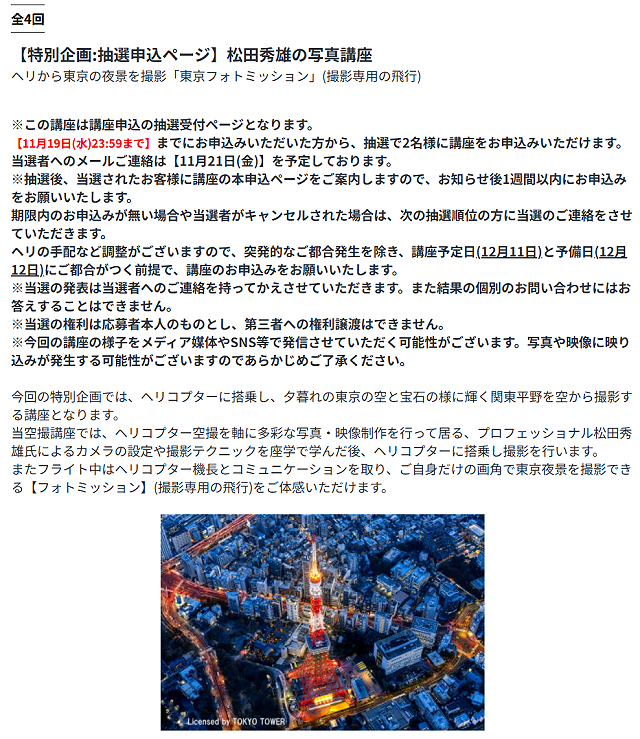 ■【特別企画:抽選申込ページ】松田秀雄の写真講座ヘリから東京の夜景を撮影「東京フォトミッション」のご案内はこちらから