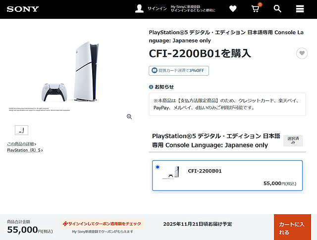 数量限定での販売ではありませんが、PS5の新型モデル発売時にはメーカー直販のソニーストアにオーダーが集中するため、短期的な品薄状態になりがちです。今回もクリスマスシーズン直前ということでオーダーが多そうですね。