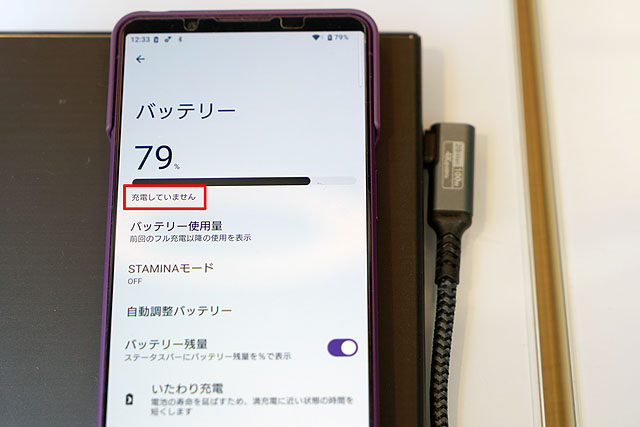 私の場合は自宅でのXperia 1 VIIの充電はVAIO S15のUSB Type-Cからの電力で充電していたんですが、これがうまくいきません。USB接続すると右上にある電池アイコンには稲妻マークが出ているので給電されているということになっているんですが、バッテリーの詳細を見ると「充電していません」という表示が出ます。